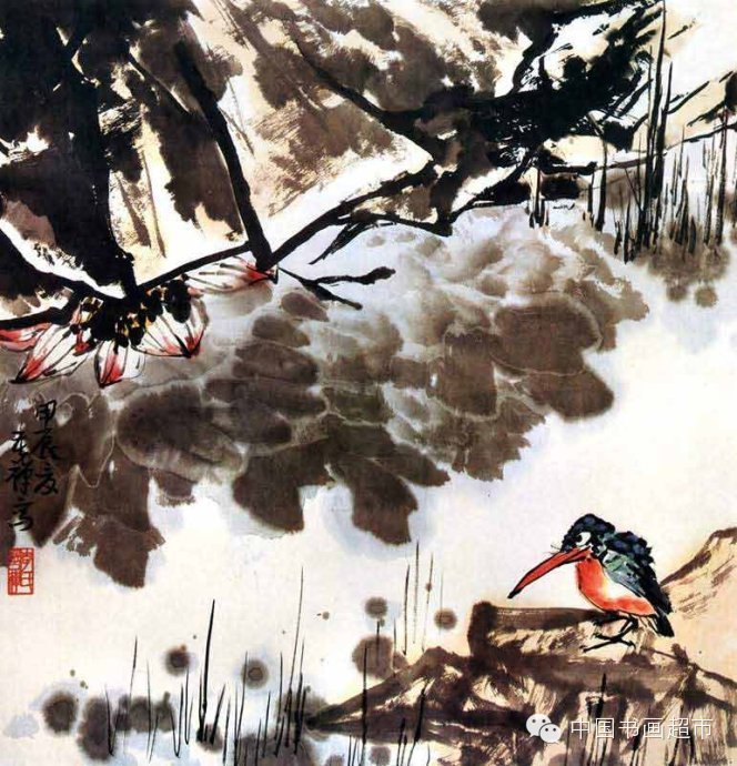 《荷塘翠羽》1964年作此 图诚然是山野荷塘大景之一角:上部岩石、荷之花叶与下部岩头“夹出”“一衣带水”,突显出“画眼”翠鸟,其朱翠之色尤鲜,与荷花朱、黄之色对角呼应而不 孤。复以萍点调整空白,以垂直错落之两丛水草增强了静谧的感觉。此系作者从当年的西湖写生中创造的独特章法,境界自远于流俗。