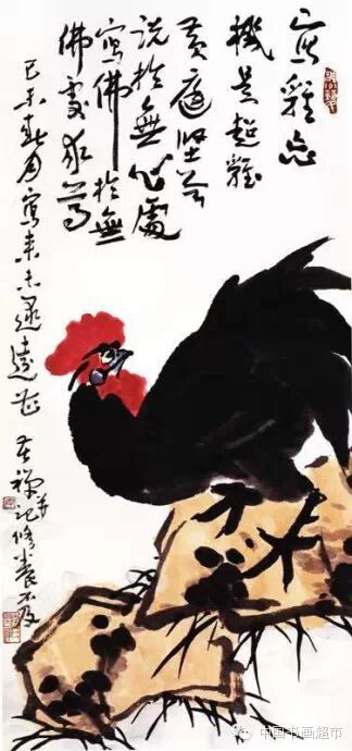 《双鸡图>1962年作此 图章法甚妙,作者系用“太极图”原理:双鸡合一体,黑中有白(翅),其势左趋而由母鸡尾、嘴之姿略呈上扬;竹崖成一体,白中有黑(竹、苔),其势右趋而由 竹垂之姿略呈下旋。双鸡左右之对势而由双首顺势而统一于左趋;竹下石上之对势,由竹垂苔落而统一于下旋之势。雄鸡尾垂势过重,以石线、苔、草之上扬抵之中 和。