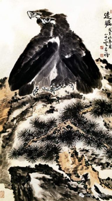 《远瞩》1973年作作 者一生擅画鹰,是爱其雄壮气质使然。此图以巨石、松冠与濛濛远峰置于雄鹰栖踞之典型环境,气势已然宏大。双鹰相偎而踞,浑如一座金字塔——近乎等边三角形 ——乃最稳重“形式感”之造型。双鹰两头合一,瞵瞵双目并视远方,浩然之气沛乎六合!全然作者人格风骨之化身。是作者老年画鹰之代表作品