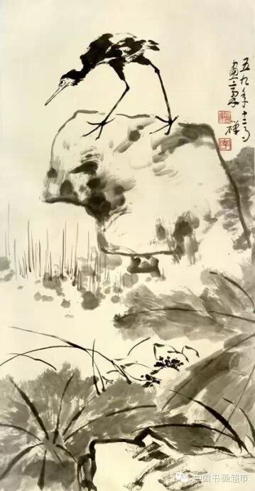 《荷塘野鹭》1959年作此 图融八大山人墨韵与徐青藤笔意于一炉,洒脱而不失严谨,经营而了无造做,行笔舒畅而绝无荒率,运墨淡雅而极富层次。所绘荷塘之景非他人成稿故材,乃系自家 于大自然中观察写生所得,故生气勃勃,尽去书斋画室闭门造车惨淡经营之弊。禽鸟跃跃之姿更去近世画者僵式之病,堪称「逸品」。
