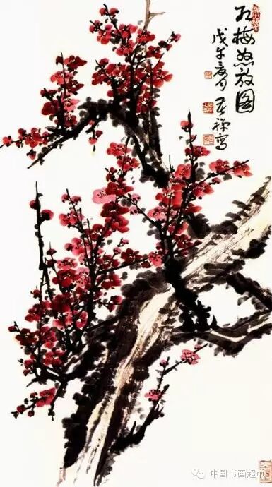 《红梅怒放图》1978年作此幅老干苍苍,如历多少风雪冰霜,终于享春风沐阳和,怒放新花。图中老干新技交互穿插,终于勃勃向上,红梅繁密有秩,疏俏提神,全然脱出古人画梅窠旧。
