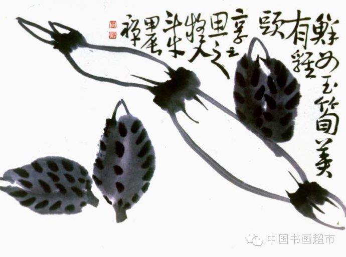 《鲜如玉笋》1964年作此 图“形式感”极强,千古无匹。先以大藕沿“对角线”而将全图一分为二。左下角以横直呈直角而置的两个浓墨鸡头米占定其位,“顶住”大藕;右上角以浓墨之鸡 头米衬于藕后,复以书法满题,图理颇似“太极图”:右上角中间之白是“黑中之白”,左下角鸡头米之黑是“白中之黑”,诚为佳构。