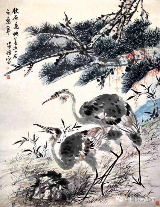 《松下苍鹭》30年代作品苍鹭系其常写之题材,造形和动态都予以夸张,连配景之松、竹也随和了主体之动态,又以坡草之姿渲染了苍鹭迎风举步的气氛。石头和远山则稳定了构图,拉开了空间。