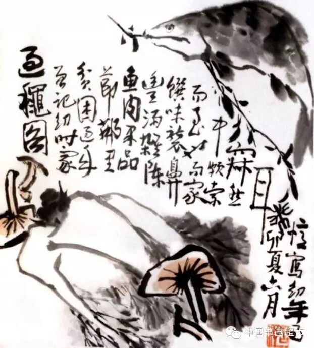 《过秋图》1963年作此 图章法甚奇:在右角柳系鱼与左角秋菜之间题满字,对角右斜而下,收于大印。题曰:“曾记幼时家贫困,过年节邻里鱼肉果品丰满杂陈,馔味袭鼻而至也。而家中 颇索寂然耳。癸卯夏六月忆写幼年事。”弘一法师曾云:“于失意人前莫言得意事,于得意时莫忘失意时。”是教人不忘本也,苦禅老人终不忘本矣!