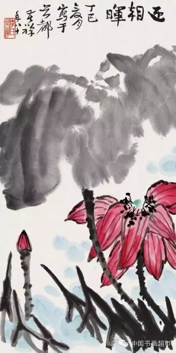 《迎朝晖》1977年作“映日荷花别样红”,不亲见真景真无以体味古人此句。我曾于白洋淀亲观朝晖映照之红荷,若红灯笼一般!此图以浓墨茨菇、荷干、荷蕊合点翠色,尽衬得花、蕾透红鲜明。为突出红荷,墨叶竟不勾筋,同花青萍点俱虚若朝雾然。