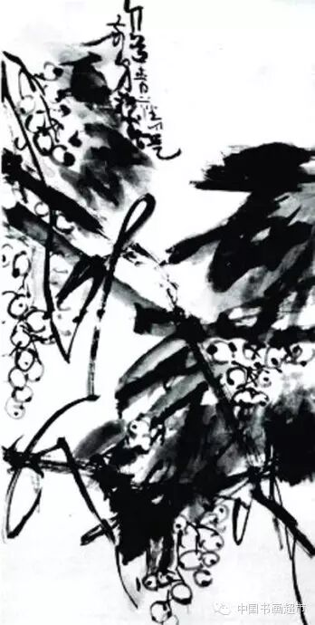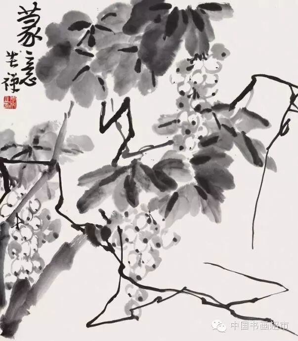 《篆意》60年代作品李 苦禅老人珍藏一副祝枝山书联“石壁挂藤通篆意,桐荫滴露聆琴声”。他认为“这里的美学极高”。此图题“篆意”即以上联之意写葡萄,全然以书法之笔趣与间架 之“计白当黑”的美感合成此幅。而且葡萄圈而“聚”,叶形放射而“散”,又于聚散对比矛盾中俱垂而下,势成统一。大干斜上分画幅为二,左上密而右下疏,风 神多在疏处小藤屈曲间自然写出。