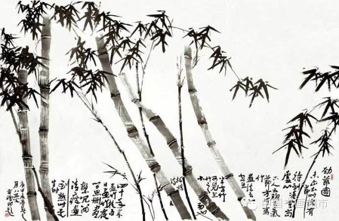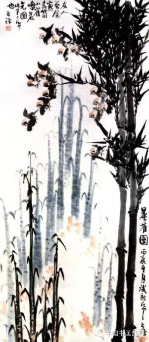 《晨雀图》1976年作通幅是一夜大雨之后的清晨气象:两株粗竹冲天而起,藏首没足。一丛新笋指天竞长。又以花青写出远处之笋,雾气爽爽然。一群麻雀纷飞而过,啾啾若闻,一派生机,盎然纸上!