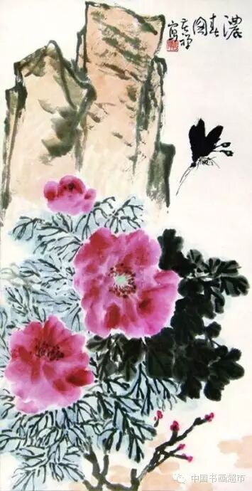 《浓春图》70年代作品此图之花不求小处变化,浑然写之,丰硕而有拙趣;叶不施绿。浓重沉着。又以小蕾上露,干枝旁出,破其呆板。赭点、大石拓其空间,让出墨蝶,最后以字点题,一派浓春气象溢然目前。