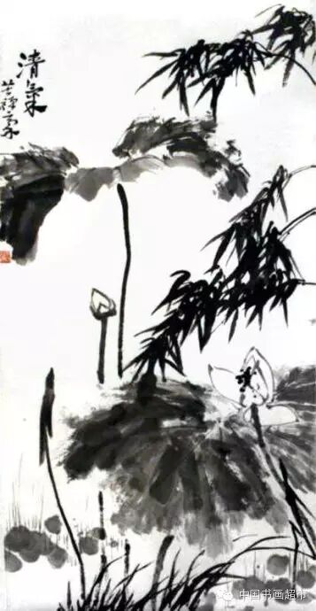 《清气图》60 年代作品 “出淤泥而不染”“香远益清”是古人赞颂荷花精神之句,故此图题为“清气”,诚作者自我人格之写照。通幅不施粉黛,尽以水墨写成,益感清爽高洁。花、叶、 蕾、茨菇、小草之间似即非离地亭亭而上,斜插垂竹两丛,似微微摇曵然,东坡云:“清风徐来,水波不兴”,境界高逸,益觉清雅之至。