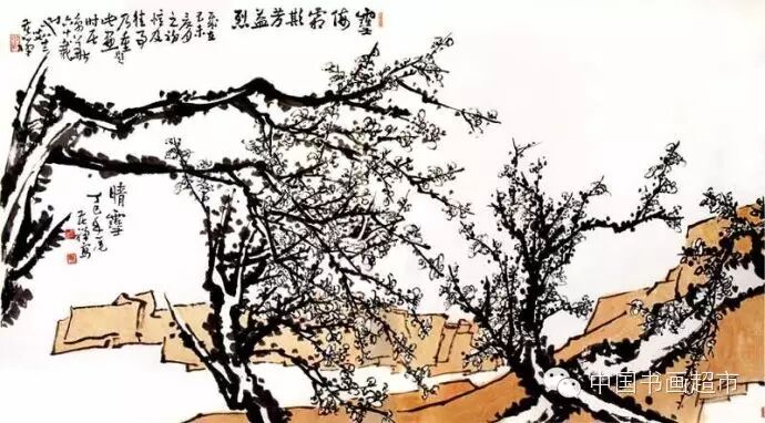 《雪侮霜欺芳益烈》1978年作通幅三株老梅横斜聚散,其后以石衬地如大雪初晴。老梅之姿似绝处逢生,于大雪久压之后依然顽强傲立,吐出新葩。题赵朴初之句“雪侮霜欺芳益烈”又以“晴雪”点题,老人心境明晰异常矣!老人常云“梅以白者最为高洁”,故此图选材即白梅也。