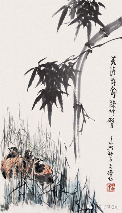 《荒渚野禽》1962年作此 图表现草丛中藏身的三只鹌鹑在警惕着四方的动静,断竹在旁,荒野情趣溢于画幅。如此取材与意境是前人与时人无例的。看章法,断竹如弓而下,以一横一垂两枝 竹叶破其干;以小枝破其梢,足令此势刚中有柔而刚柔相济,复以丛草如箭上冲之势而抵之;以纵题行草合大印而“收式”,开阖正宜。