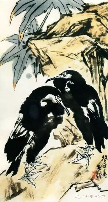 《双栖图》1973年作自 二十年代初期,李苦禅将渔鹰首创引进写意画之后,一生常写之,至老年而乐此不疲。此幅一对渔鹰相对栖息,浓重的用墨和合适的留白,表现出渔鹰那特有的密羽 光泽,又将其足“改造”为鸭足且加夸张,更显得舒展稳定,全然是他亲自饲养与速写渔鹰的当然成果。再配景形成了稳固的“L”构图。