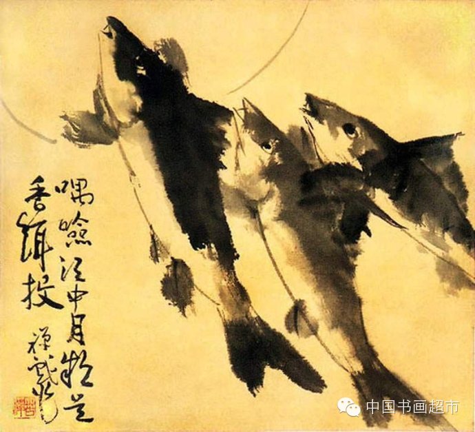 《喁噞江中月疑是香饵投》倾向于1958年 此 图系用“习大仿”的元书纸所作。作者不少习作皆用此纸,其文人笔情墨趣常有胜乎宣纸者。此图取景角度竟在“水下”,古人有先例乎?三条鱼以多锐角姿态形成 “最有力角度”(45度)之“合力方向”冲向月光,似奔香饵然,非文人雅怀安有如此画思?至于墨色笔迹之浑浑然,正增添着月色朦胧之感。李苦禅故友国学家 包于轨先生评之曰“仙品也!”