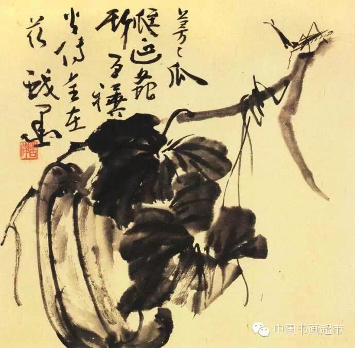 《水墨写瓜》50年代作品 题 字“蔓蔓瓜瓞延螽斯,百祀皆传全在兹。戏墨。”与瓜、叶皆置于图左,却以瓜蔓少许与高踞欲下的草虫平衡了画面,诚“四两拨千斤”拳理之妙用!此虫北方名之 “「担杖钩”,作者幼时常捉而画之,故援笔信手写来简捷生动,又寓青藤笔趣。粗蔓颇具八大山人“棉里藏针”之妙,细蔓尤富“大草”书法入画之功。
