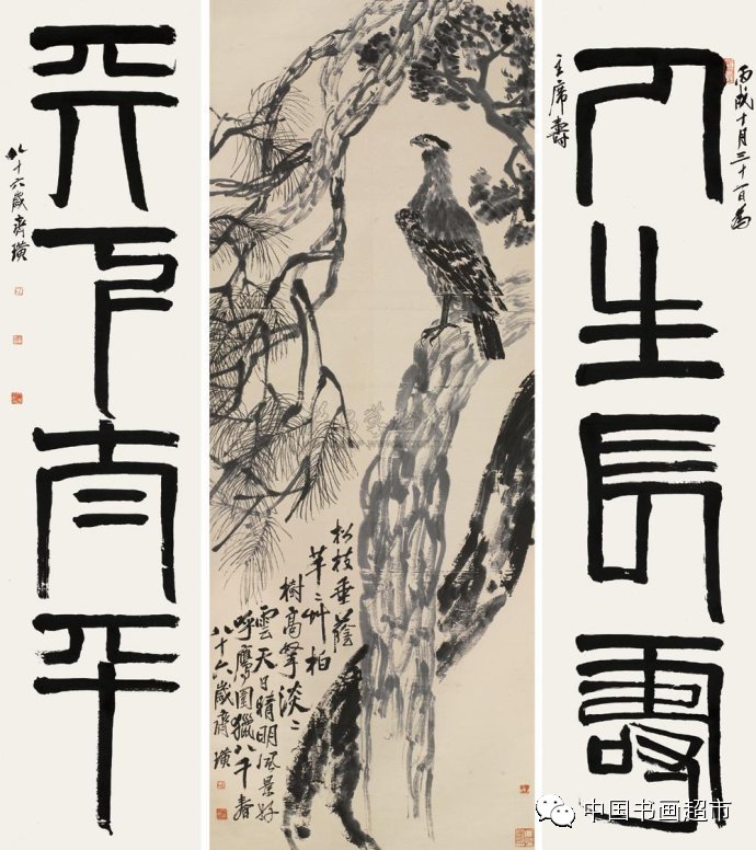 拍 品介绍:齐白石代表作《松柏高立图·篆书四言联》,长266厘米,宽100厘米,为历年公私所见齐白石最大尺幅绘画及书法精品。图绘雄鹰傲然立于苍松之 上。松鹰是齐白石最喜欢的画题之一,“鹰”寓意“英雄”,刚健有力,而“松柏”则有长寿之喻。所匹配的篆书“人生长寿,天下太平”对联,单幅纵264.5 厘米,横65.8厘米,画面气势宏伟,与之匹配的篆书四言联,则浑厚自然、端庄大气,堪称齐白石书法精品。白石老人此画创作于1945年抗战胜利后,其时 画家86岁,正是齐白石艺术创作的成熟期。作品表达了画家对国家民族和平发展的美好祈望,当时为蒋介石六十寿庆所作。2005年由美国旧金山私人释出后流 入大陆,此番亮相受到藏家热烈关注。