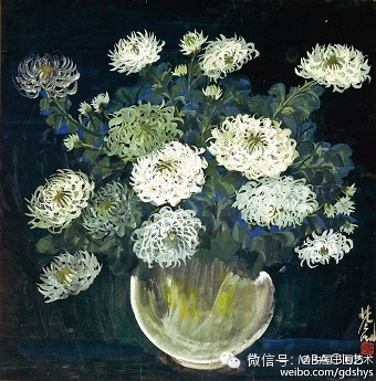 以近乎墨黑的背景来突显菊花,首先打破向来讲究留白的文人诗画传统,林风眠在此采用了“计黑当白”的原则,在黑色背景中刻画出白色的菊花与花瓶,观者除了明亮的主体外,无法掌握确实的空间感,因而创造了画面幽深莫测的感觉,塑造出深沉、静谧的氛围。