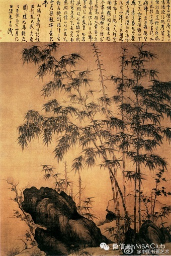 此图画竹,前后左右交错,枝叶繁茂。竹叶以墨色细加渲染,表现出阴阳向背。湖石团浓淡墨晕出,玲珑多姿。构图匀称,笔法圆劲精整,设色淡雅。画家通过碎石、枯枝等周围景物的描写,更加烘托出竹子“清高拔俗”的品格。