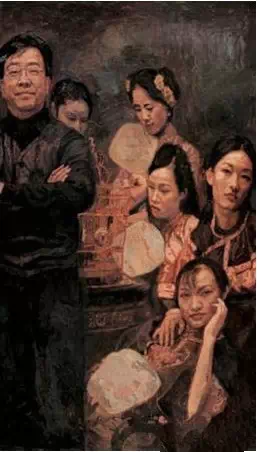这是陈逸飞未完成的遗作。画家陈逸飞位于《艺术家和众美女》的左侧,双手交叉胸前,眼神奇怪地直视观画的人们,画面的大部分是5名陈逸飞笔下的古典美女。