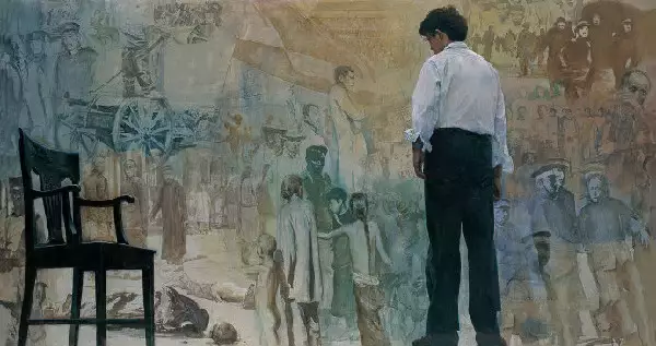 《踱 步》创作于1979年,是一件自画像性质的作品。画家首次也是唯一一次在作品中画了自己的背影,表现出以人文视角反思近现代史的主题。画面的左侧是一把带 有厚重历史感的老旧黑色靠背木椅,右侧是艺术家自己低着头沉思的背影,背景则是鸦片战争、甲午风云和八国联军等内容的历史画卷。