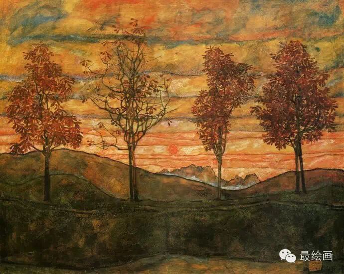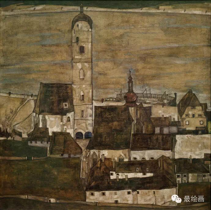 1890年6月12日,埃贡·席勒出生在下奥地利省的图尔恩小镇,这里位于维也纳以西约20英里。他从中学时代起就酷爱美术,利用业余时间勤奋作画,在他早期作品中可以看到克洛斯特新堡的教堂和修道院。学院派和印象派的画法为他打下了坚实的造型基础。在受到克里姆特和科柯施卡的影响后,作品突具装饰风格。如果说克里姆特的艺术是从象征主义走向表现主义,而席勒则已走进了纯粹的表现主义天地。其绘画特别强调人手和脸部神经与血管在刹那之间的表情,并细致入微地刻画出来,可以清晰地看到人物情绪的变化。1918年秋天,他因流感而身故,年仅二十八岁。近百年来,这位英年早逝的天才艺术家越来越受到人们的推崇,他创作的300多幅绘画已经销售一空了。由于审美观点不同,我更偏爱他的风景画作品。