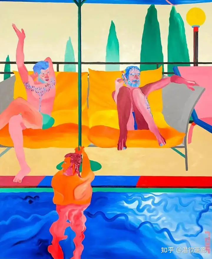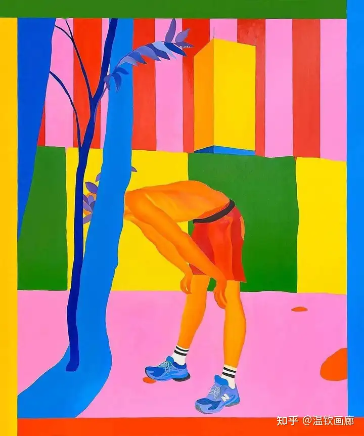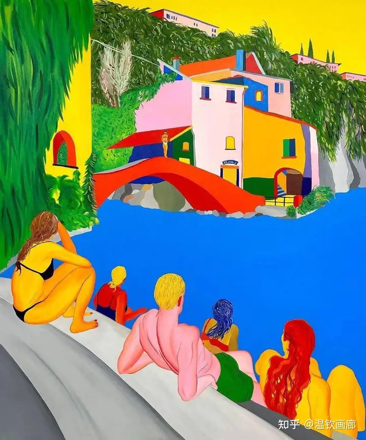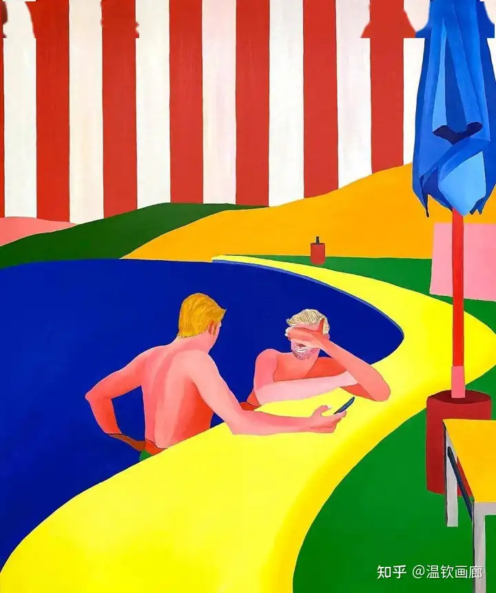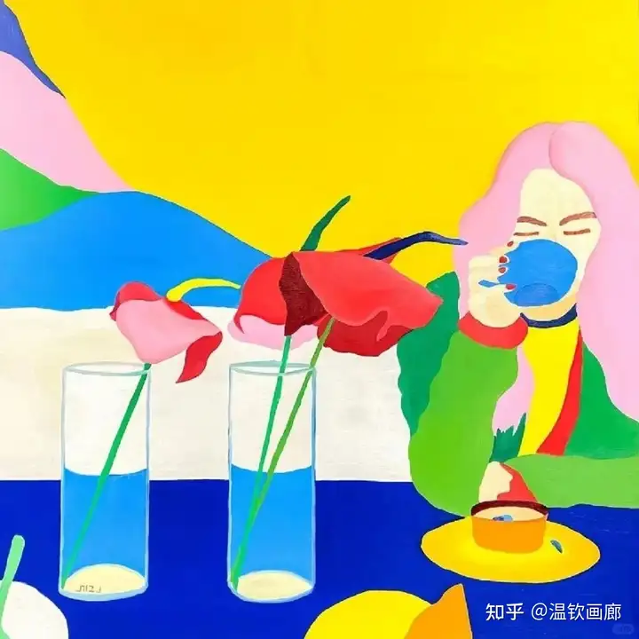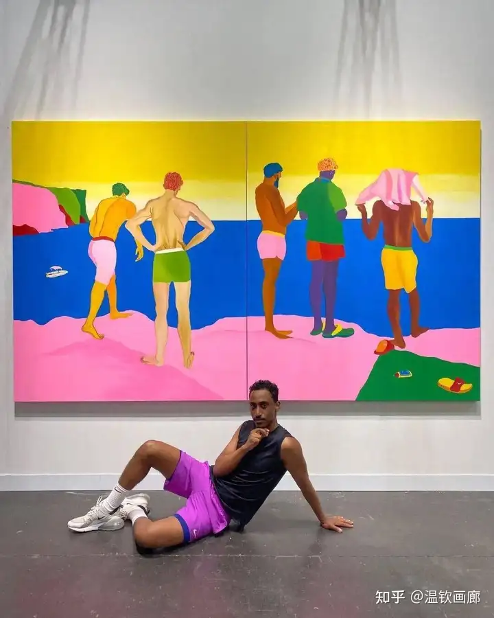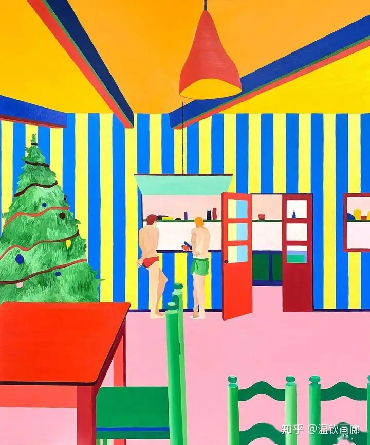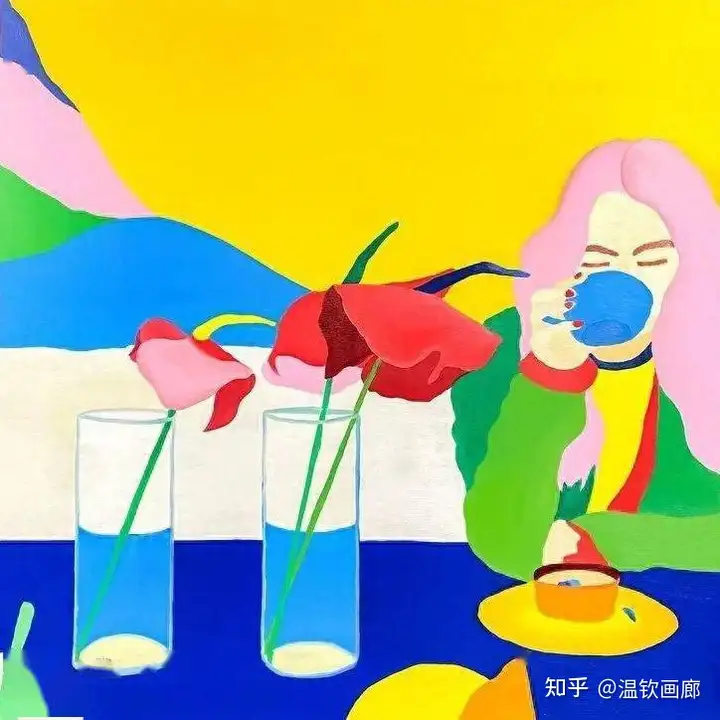 其作品聚焦亲密互动与情感主题,通过多层次拼贴和对比色营造戏剧性效果,风格兼具悲剧与积极情感。