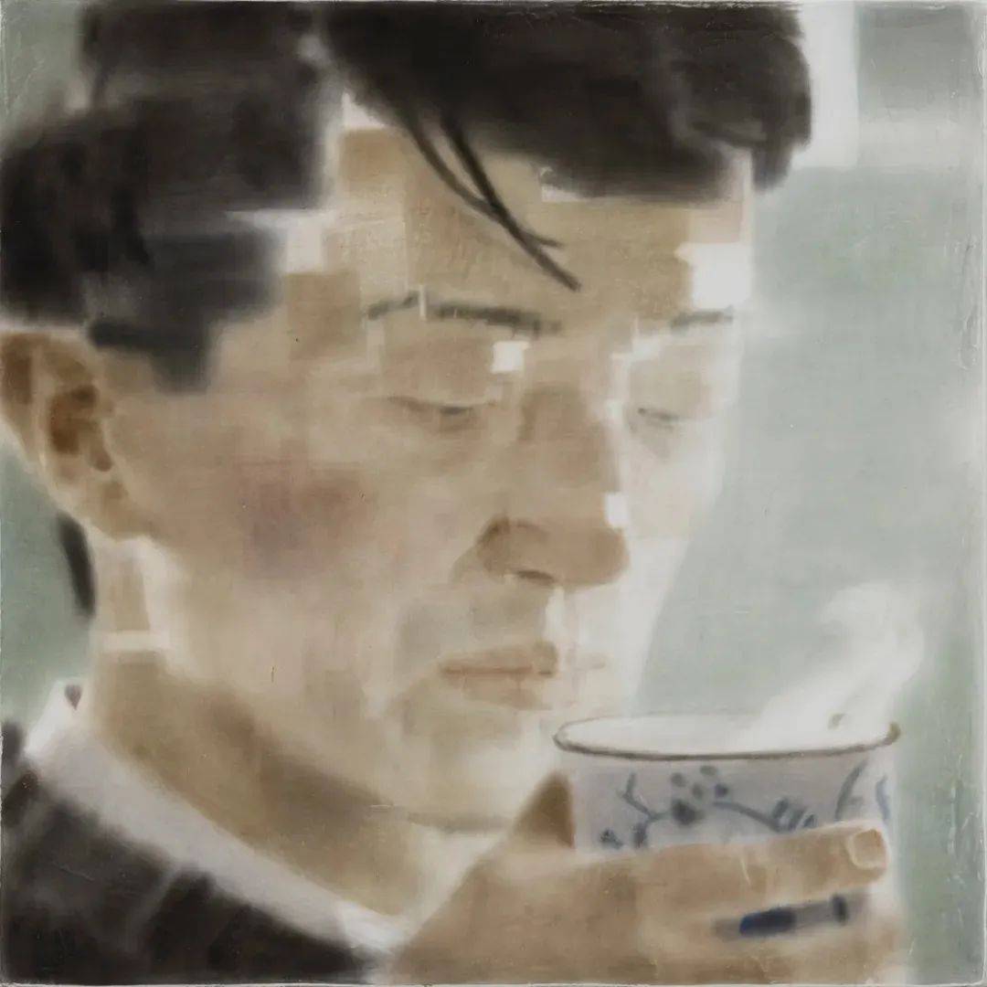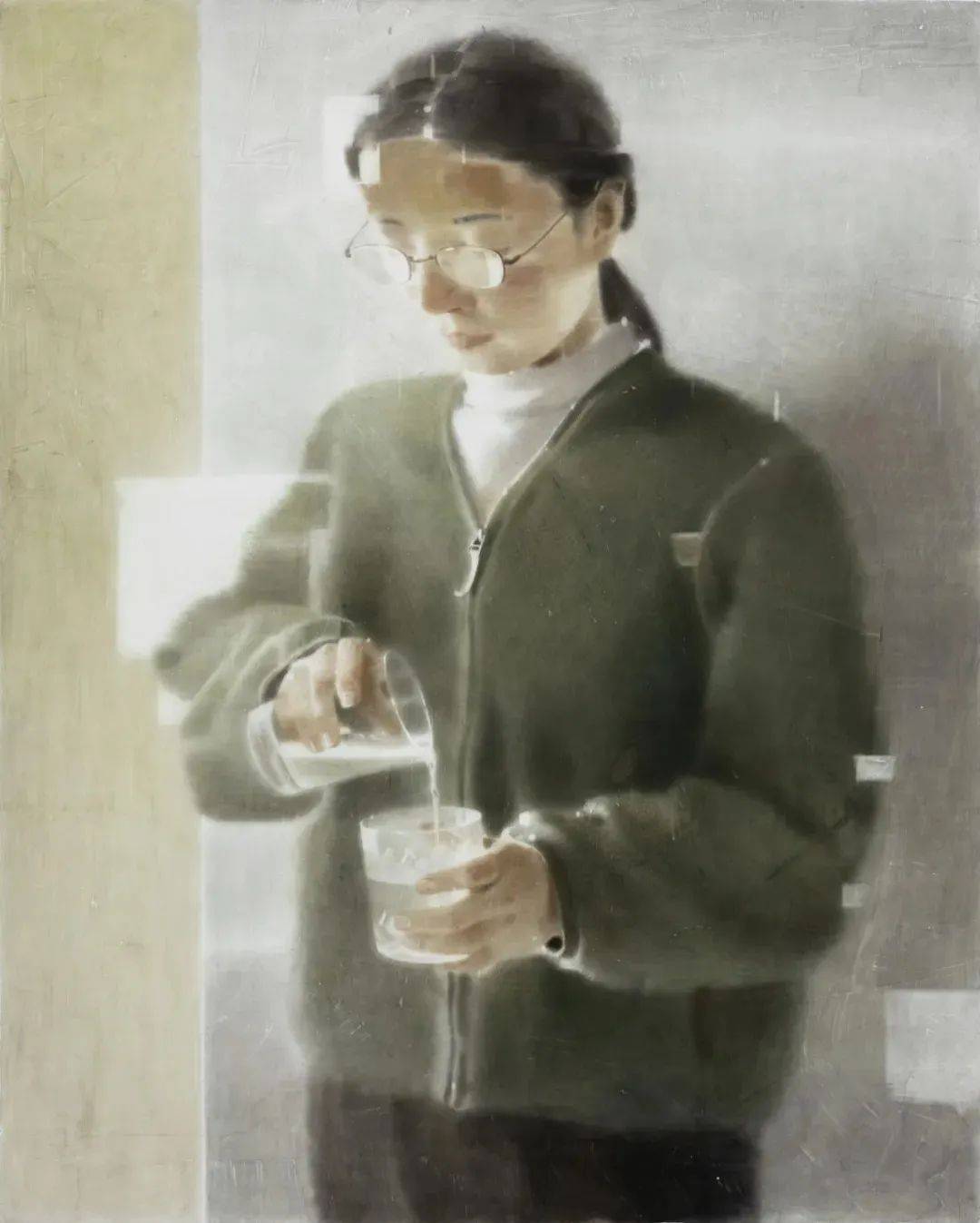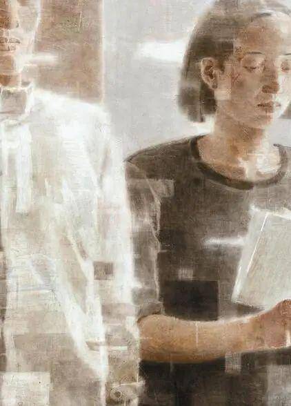 看他的作品,斑驳的光感和半透明的层次,呈现了人物和物像的细腻质感。