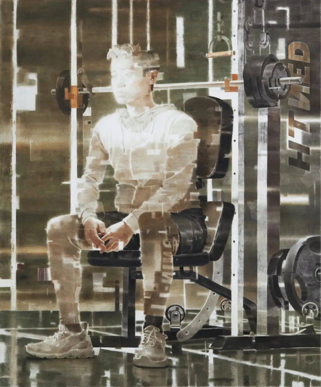 受到电影和文学叙事的影响,夏禹画面中的人物大部分采用了近景式的构图,层层叠加的笔触和渐变过度的色块将具体的人物形象抽象化,使他们形成一种介于马赛克壁画和旧影像之间的效果。丰富的细节,对光影的把控,淡茶色与淡绿色的使用让画面人物仿佛笼罩在一种怀旧的氛围中。绘画中的场景不断的在居所与公司、城市与自然、家务与工作之间游走,人物在刻意模糊化的室内与室外场景中切换着不同的角色,平行时空的多重身份为凡庸的生活平添一丝趣味与不确定性。