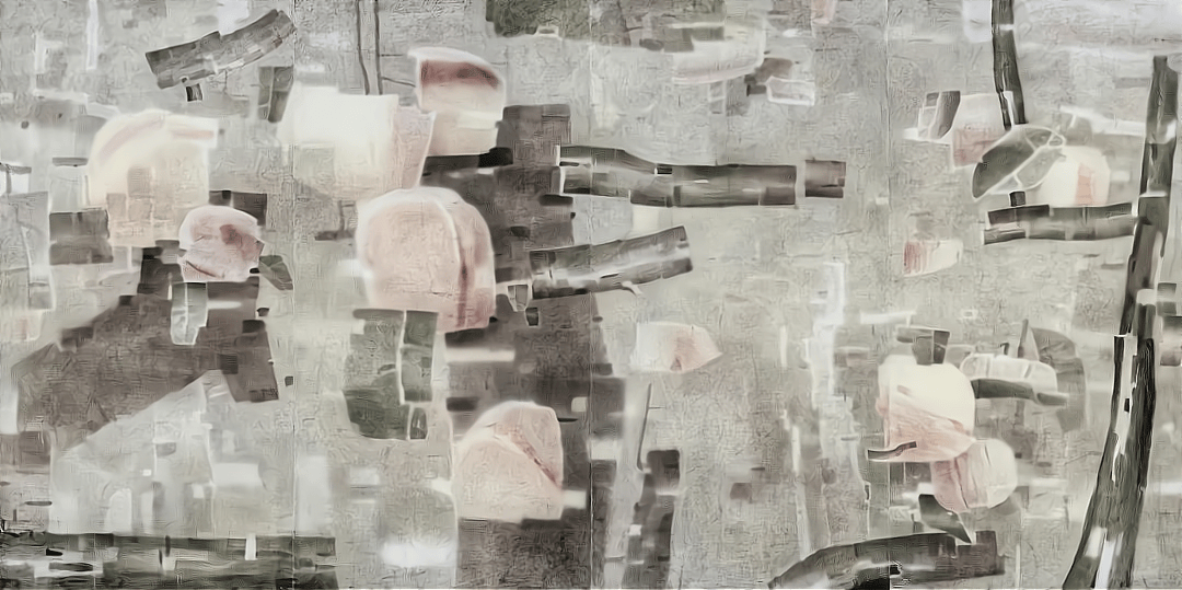 《桃园》作为大尺幅的作品,显示出夏禹对于光影变化组成的结构关系有着细致的考量,留白的色块错落在画面产生一种具有韵律节奏感的视觉体验,色块与桃树的枝干配合,形成类似于拼贴创作的压叠感的空间关系,较为密集的色块又让人联想起数码像素的图像符号。坦培拉原本的物性,在夏禹的调和下,拥有了水墨画的轻薄,颜料与形体之间融为一体。作品的模糊感使得画面的主体离真实变得遥远,而这也让所有事物变得平等。 虚虚实实,徜恍迷离,夏禹在这片桃园中挑战了我们常规的观看秩序和图式逻辑。