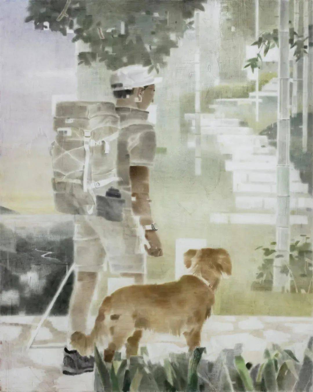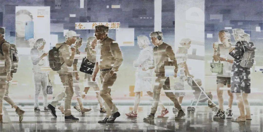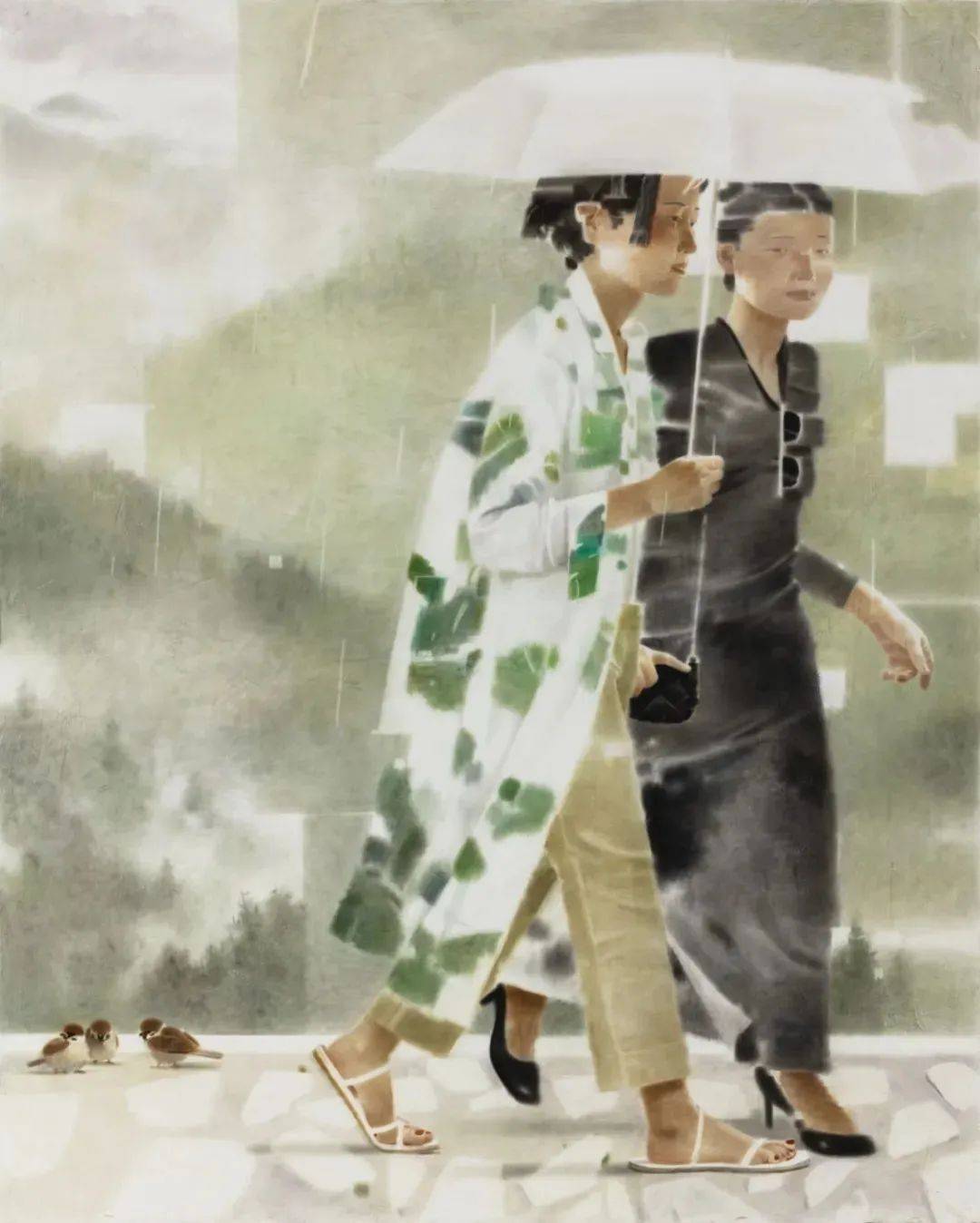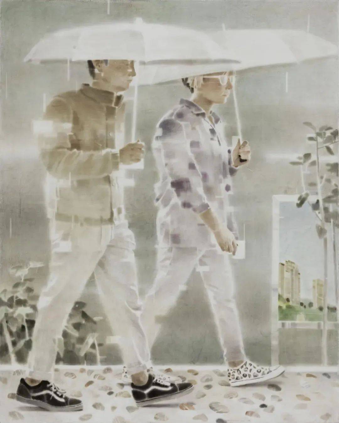 创作于2015年的《行走的人》采用了其标志性的坦培拉绘画技法,轻薄透明的色块带着一种柔和的光感和独特的透明感,层层晕染和留白的过程与水墨画中的技法有着相通之处,使画面呈现出一种“褪色”的假象。作品中的都市白领身着西装,手提公文包,行色匆匆,飘起的西装令画面更显生动。夏禹作品中的人物都有特定的着装,通过衣着打扮的形式赋予人物不同的角色。有时特定的场景决定人物着装,有时人物着装暗示特定场景—在此,夏禹如同导演一般把控着角色和场景之间的关系,缜密的构思揭示了一种后现代性的观念,记录着这个时代下一个个典型性的瞬间。
