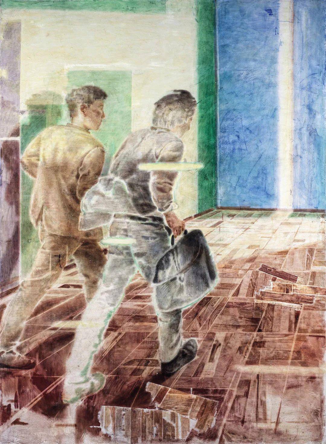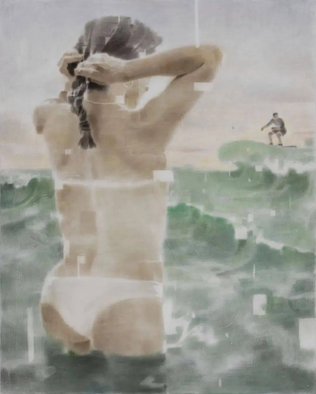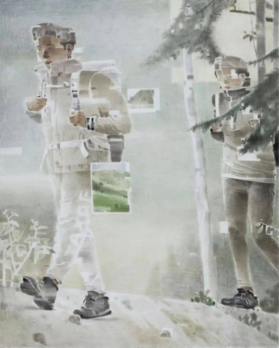 创作于2015年的《行走的人》采用了其标志性的坦培拉绘画技法,轻薄透明的色块带着一种柔和的光感和独特的透明感,层层晕染和留白的过程与水墨画中的技法有着相通之处,使画面呈现出一种“褪色”的假象。作品中的都市白领身着西装,手提公文包,行色匆匆,飘起的西装令画面更显生动。夏禹作品中的人物都有特定的着装,通过衣着打扮的形式赋予人物不同的角色。有时特定的场景决定人物着装,有时人物着装暗示特定场景—在此,夏禹如同导演一般把控着角色和场景之间的关系,缜密的构思揭示了一种后现代性的观念,记录着这个时代下一个个典型性的瞬间。