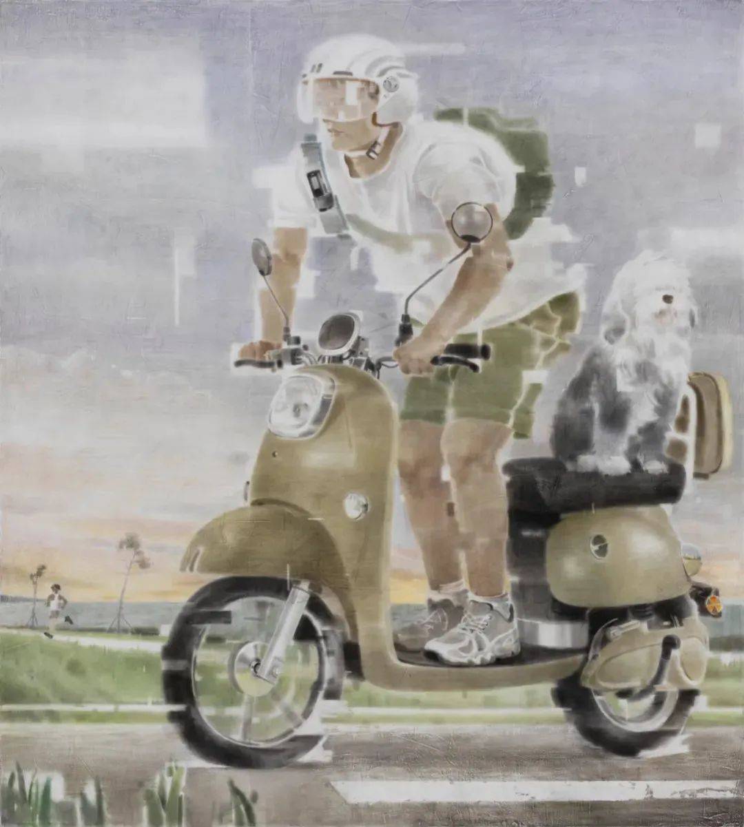 《电动车,落日,狗》2021 木板坦培拉 200×160cm
