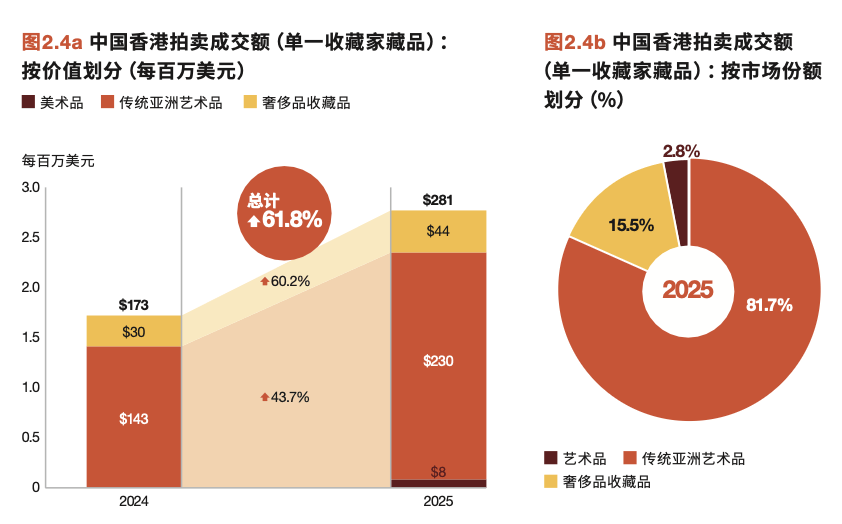 报告揭示了香港拍卖市场一个重要的结构性转折:传统亚洲艺术品(包括中国书画、瓷器及古董等)成交额逆势增长32.4%,占香港拍卖总成交额的37.2%,重新超越纯艺术品(Fine Art)的26.7%份额,成为最大收藏板块。