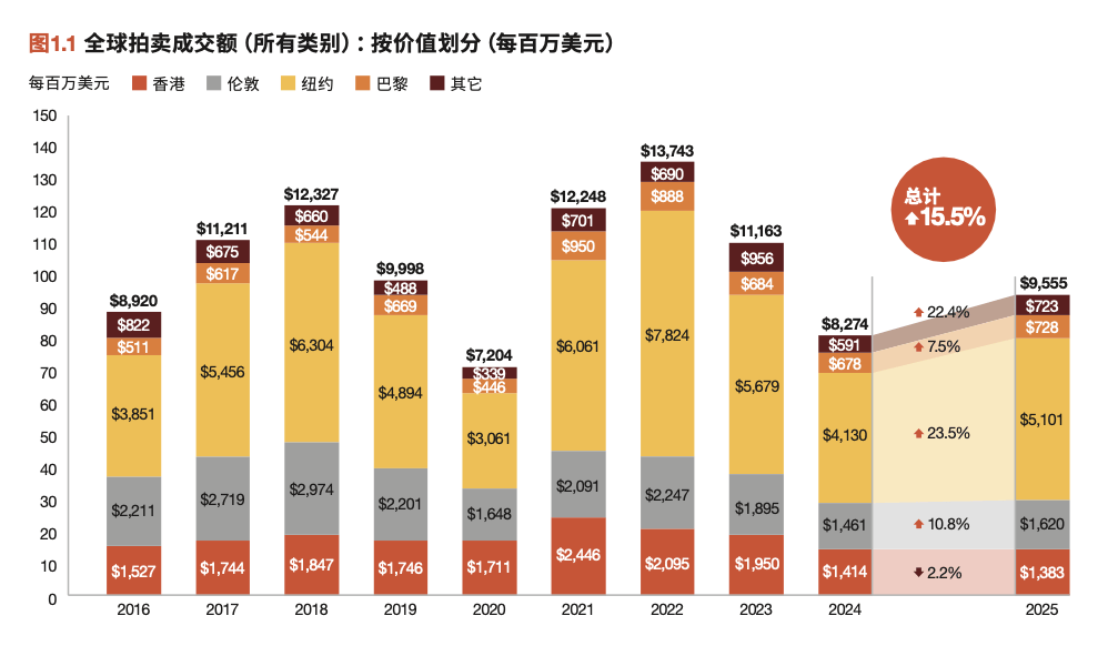 - 美国:尽管 2025 年贸易政策存在不确定性,且此前已经历两年市场下滑,美国销售额仍达到 260 亿美元,按年增长 5%。高端市场在部分领域恢复增长,在美国拍卖市场中,成交价超过 1,000 万美元的纯艺术作品总成交额增长近 40%。