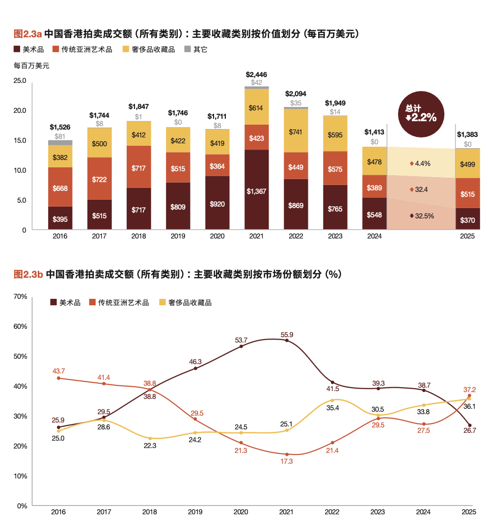 进入2025年,降幅大幅收窄。报告显示,香港全品类拍卖总成交额为13.83亿美元,仅比2024年下降2.2%。与此同时,全年成交量达22247件,同比增长4.4%,创下十年新高。这种“量增价平”的格局,显示市场底部正在夯实。