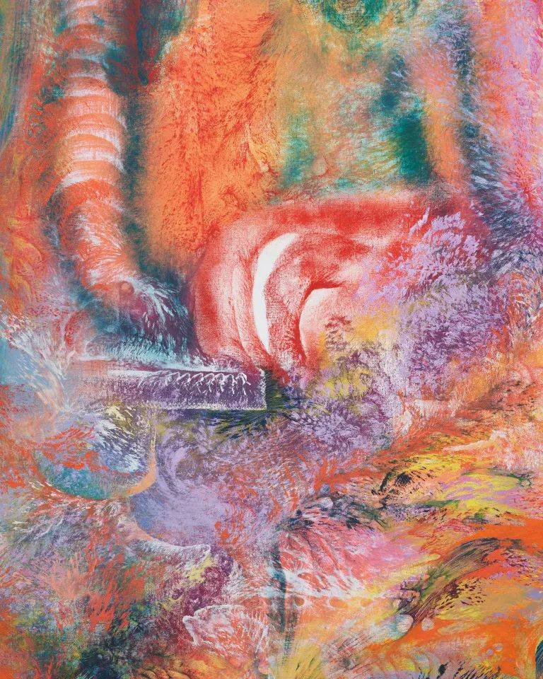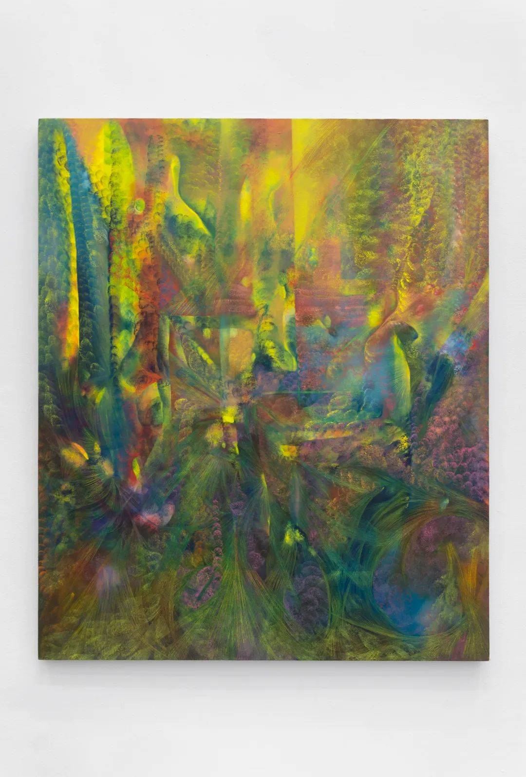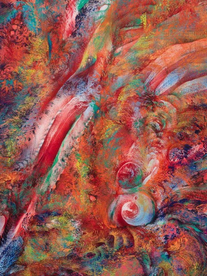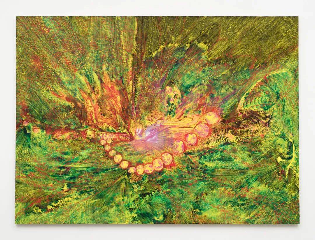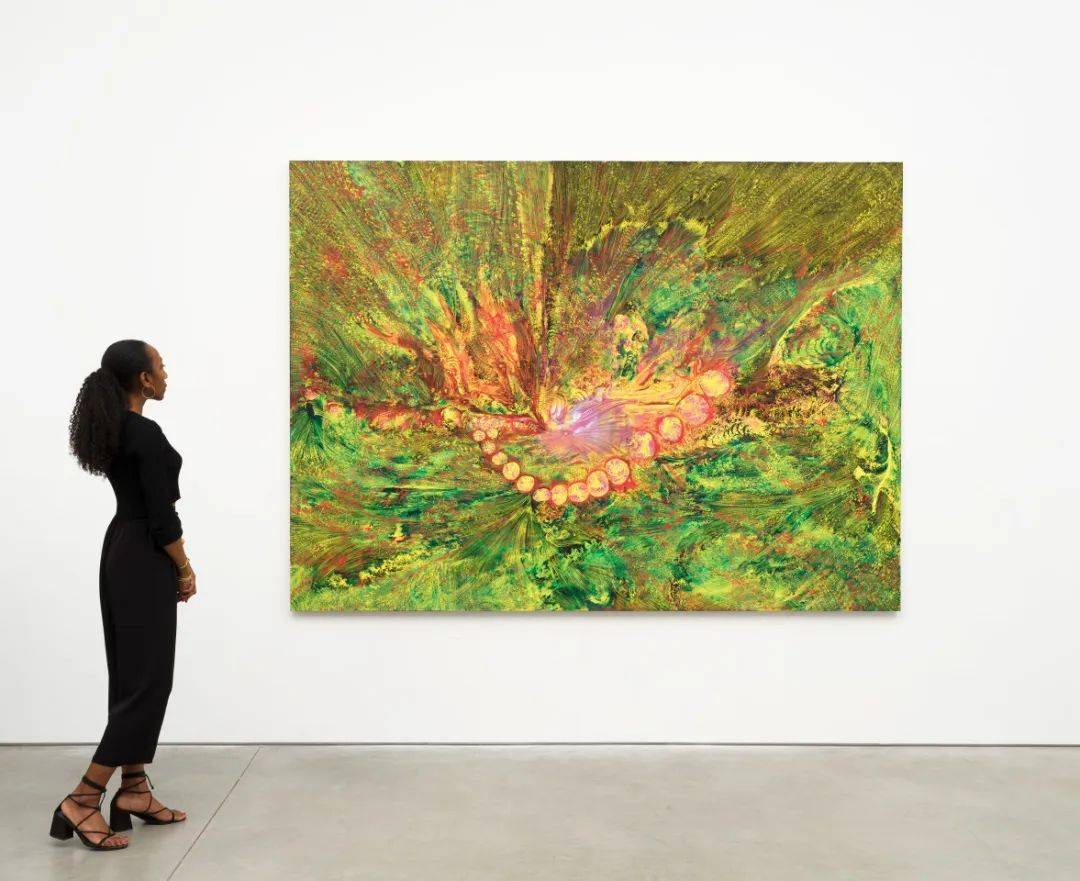 "从远处看,她那些充满幻象的绘画会凝结成图像;如海市蜃楼一般,它们极富联想性——生物形态的、建筑性的、宇宙尺度的。你的眼睛在这些粘稠的物质效果中层层展开,而你的思维则在各种联想之间不断循环。"