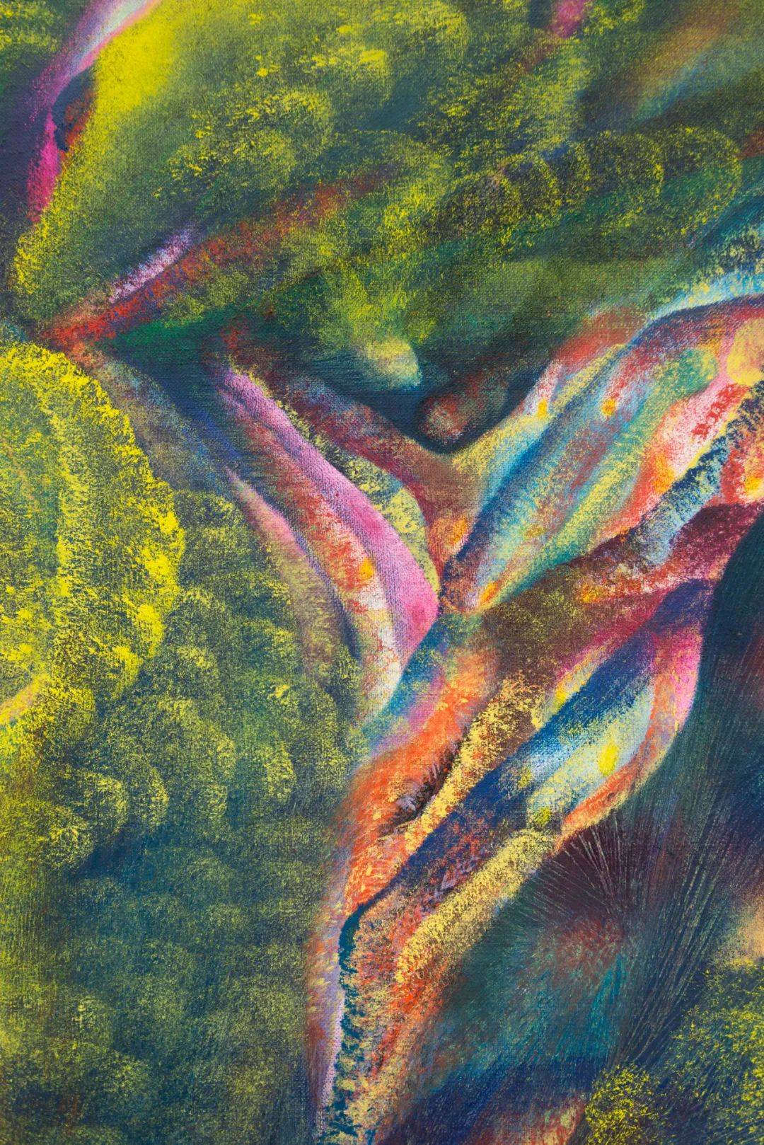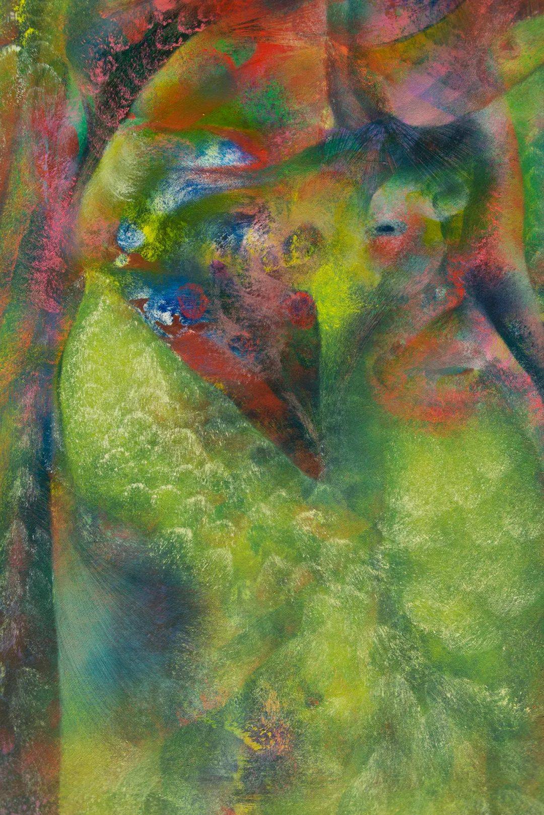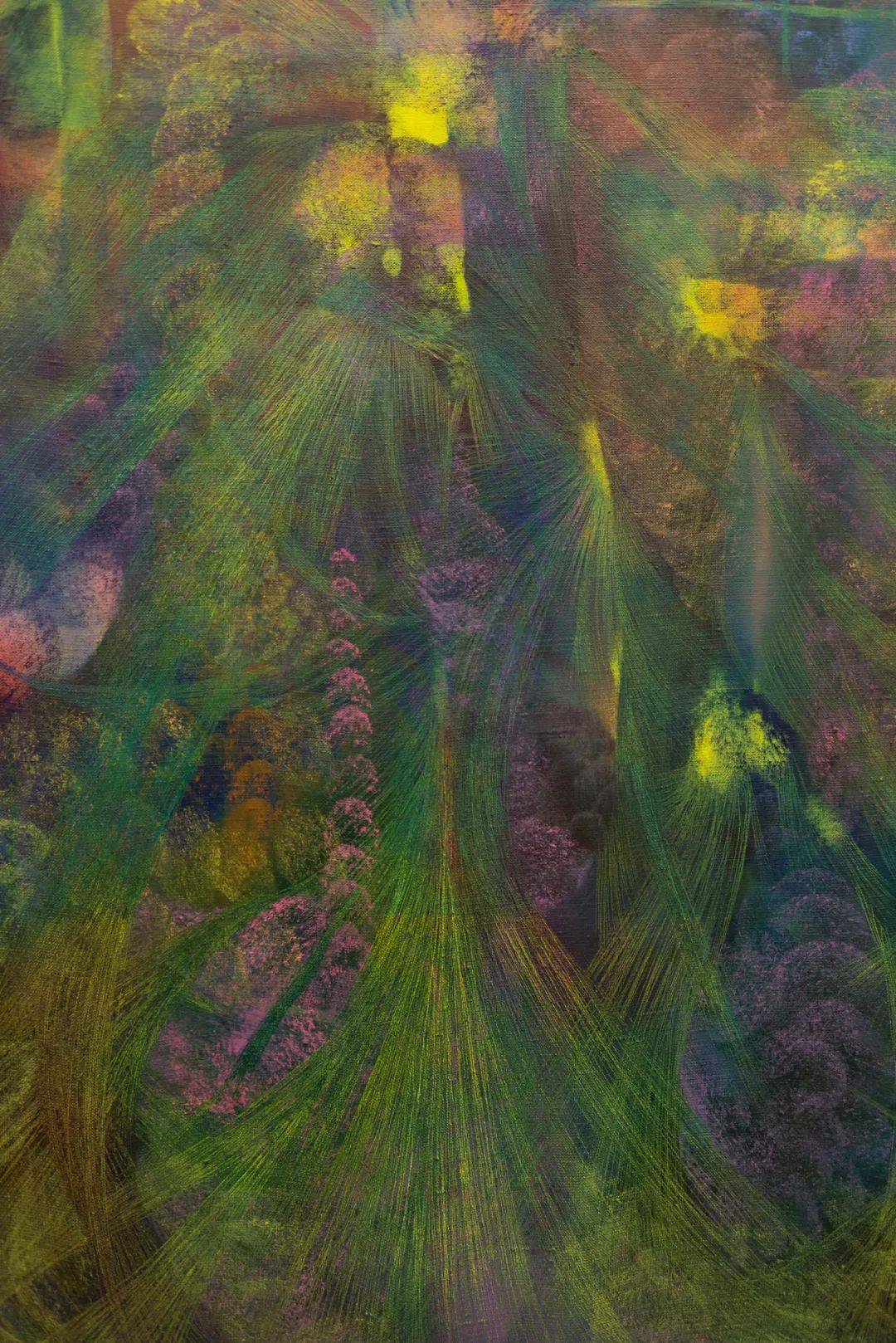 在色彩选择上,她的色调组合游走于灵异、轻盈与隐约的粗野之间——接近以太的神秘,也触碰某种怪诞的边缘,并在意识与无意识相遇的柔软地带上暴露出脆弱。