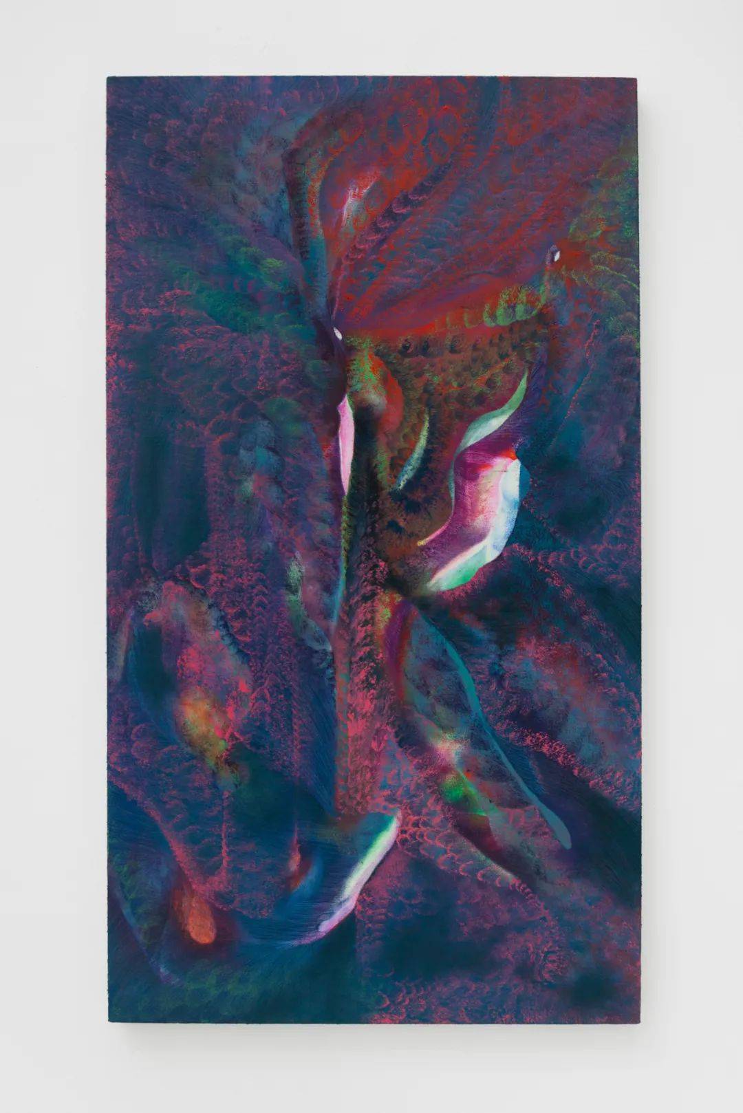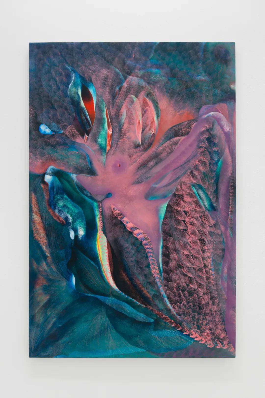 她的创作融合了超现实主义绘画、好莱坞电影与神秘的神话故事,形成了一种独特的“具象绘画”。她的作品不仅仅是形状和色彩的组合,更触发了声觉、触觉乃至情感的涟漪。这些绘画形式仿佛是“视觉诱饵”,将观者的视线吸引到构图之外的氛围空间中,与之无限的联想交汇。