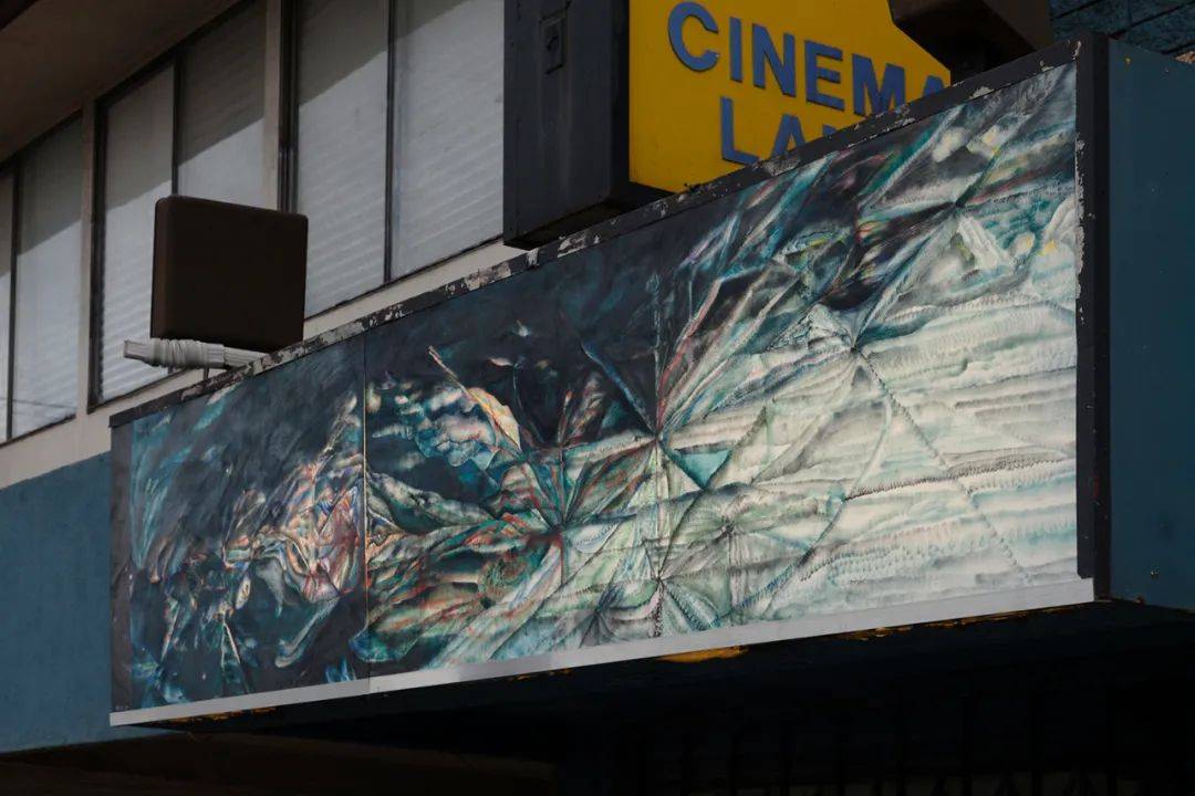 The Damage, Oil on acrylic mounted in marquee of Human Resources, 148 x 36 inches, 2019