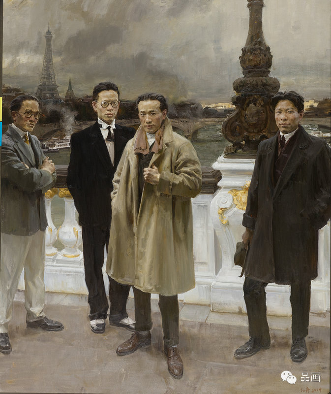 画的正是中国美院第一代传奇:林风眠、吴大羽和林文铮,他们三个站在巴黎著名的亚历山大三世桥上,背景是埃菲尔铁塔。现场评审的29位评委认为,这幅油画“有一种历史性的风景情怀”