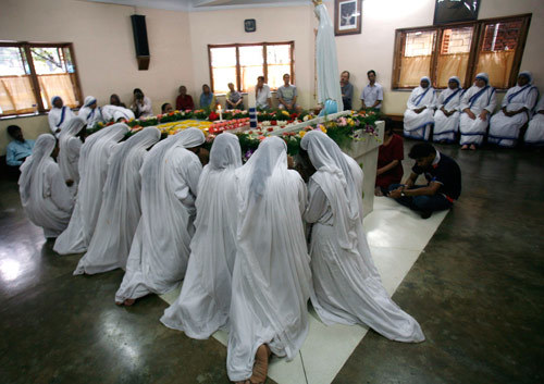 印度为德蕾莎举行了国葬。出殡那天,她身上覆盖的是印度国旗,就在她的遗体被12个印度人抬起来时,在场的印度人全部下跪,包括当时的印度总理。遗体抬过大街时,大街两旁大楼上的印度人全下楼来,跪在地上,向这位爱的天使表达最高的敬意。
