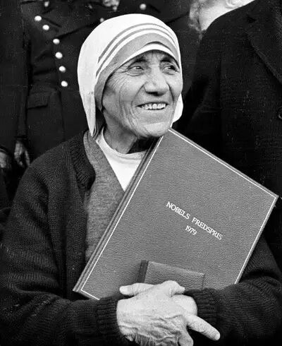 1979年,德蕾莎修女获得诺贝尔和平奖。她身穿一件只值一美元的印度纱丽走上了领奖台。不论是和总统会面还是服侍穷人,她都穿着这件衣服,她没有别的衣服。台下坐着珠光宝气、身份显赫的贵人,她视而不见,她的眼中只有穷人。台下立刻鸦雀无声。