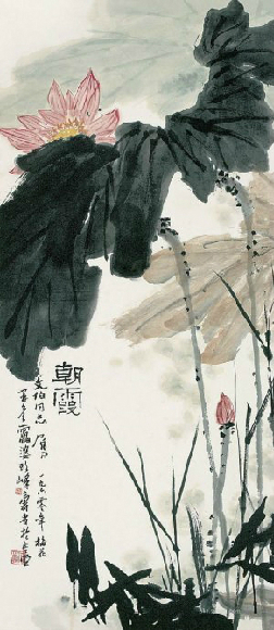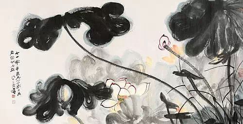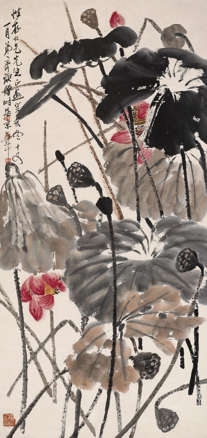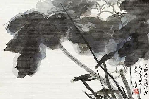潘天寿的荷花笔墨苍古、凝炼老辣,且大气磅礴,雄浑奇掘,具有摄人心魄的力量感和现代结构美。
