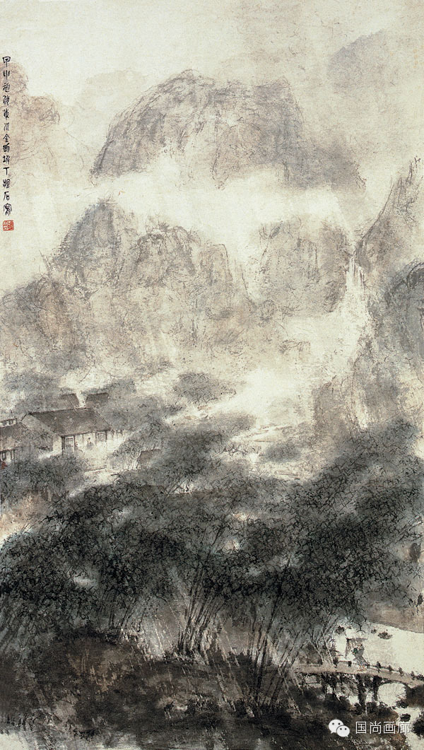 “抱石皴”得益于重庆郊区金刚坡。1939年春至1946年秋,傅抱石先生一家一直居住于金刚坡茅庐。这里山势雄奇,云雾缭绕,茂郁野莽又不失秀润。茅庐则左依金刚坡,背靠几株松柏,修竹林环绕期间,却似一幅雄奇的图画。