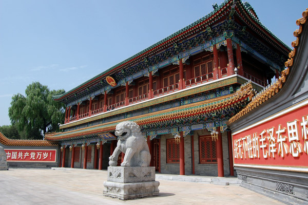 中南海,新华门:曾经香妃的宝月楼依然完好的保存到今天,只不过它摇身一变成为了中国“最高”(事实上)也是最为神秘的权力机构——中南海的南大门。两边的大标语依然存在到今天,而门内的影壁则上书五个大字——“为人民服务”。
