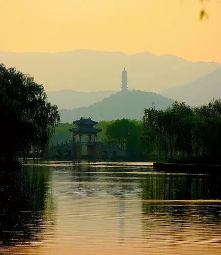 颐和园,昆明湖:夕阳西下,玉峰塔和远方的西山交相辉映。可惜的是,我们只能远观现已成为军事禁区的这等美景了。(图/高星翼)