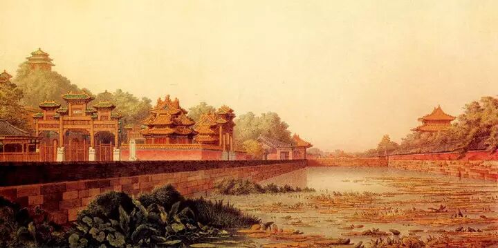 景山前街扩建前,大高玄殿与筒子河相接时的全貌。/[德]希尔德布兰特,1864年。
