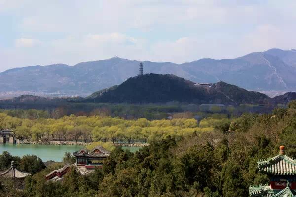 从万寿山上向西远眺玉泉山:正值春日,阳光明媚,西山依稀可辨。可惜“燕京八景”之一的玉泉趵突早已消失得无影无踪。