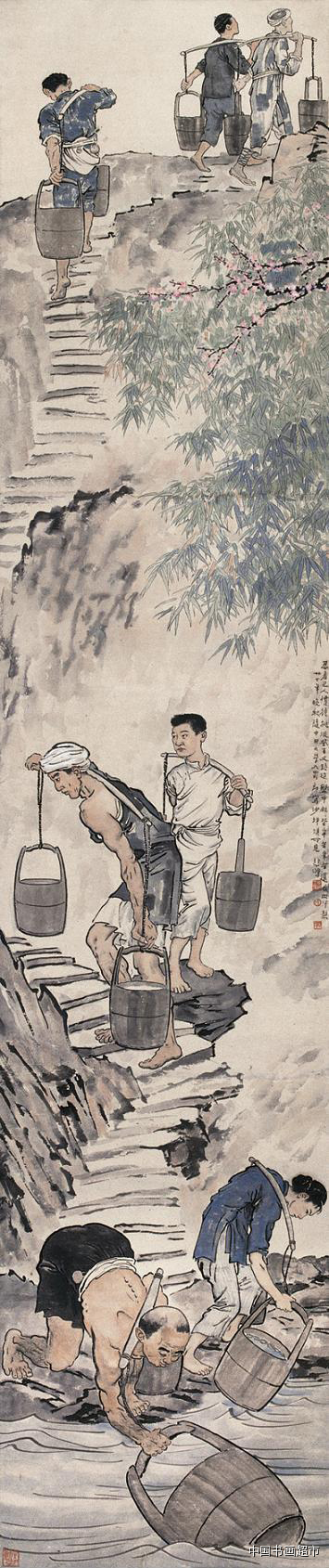 拍品介绍:《巴人汲水图》是一幅真实记录重庆人民辛勤劳作的艺术珍品,被誉为徐悲鸿先生最具人民性和时代精神的四大代表作之一。该作品在构图上匠心独 运,上下百丈石阶挑水的巴人闪烁着感人至深的华夏精神,给人以呼之欲出之感。通过此画,徐悲鸿实现了其中西融合的抱负,将绵延数千年的中国传统绘画引向具 有现代精神的写实。《巴人汲水图》的创作成功,在当时社会上引起极大的反响,作品1938年展出时,即被誉为“五百年来罕见之作”。