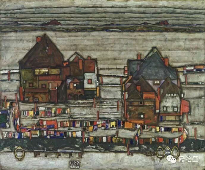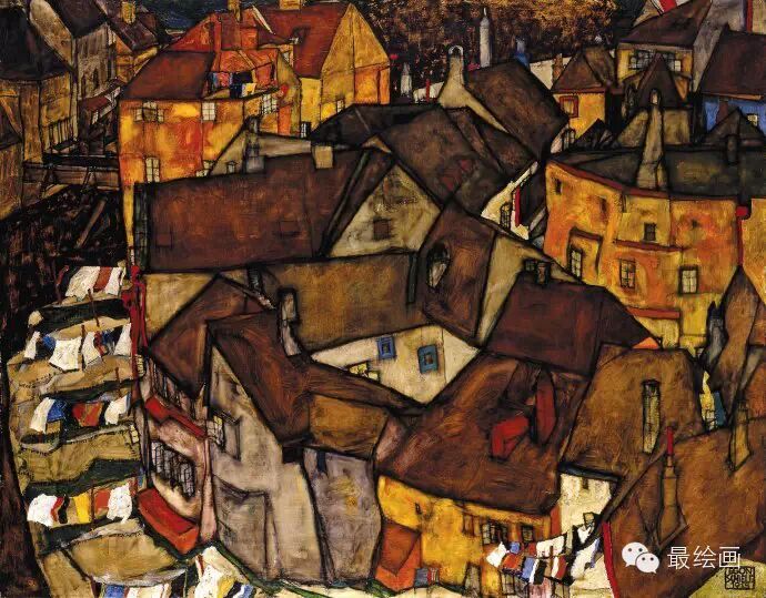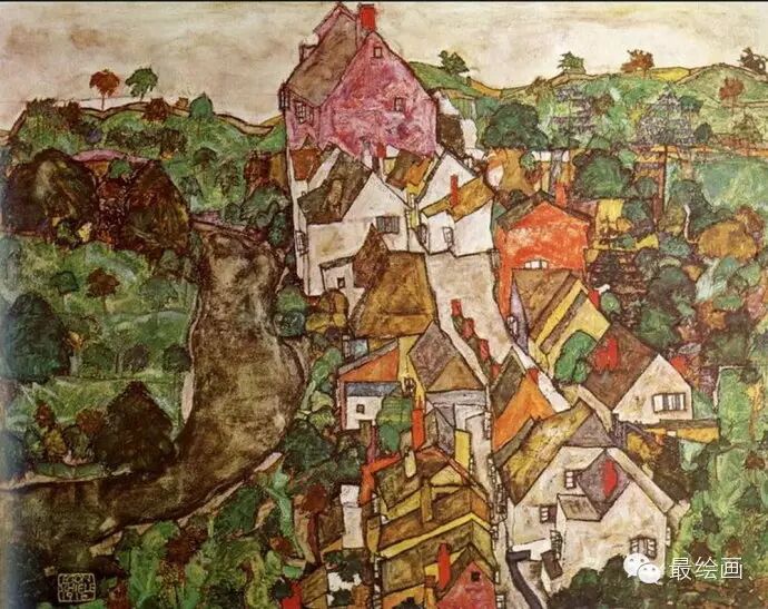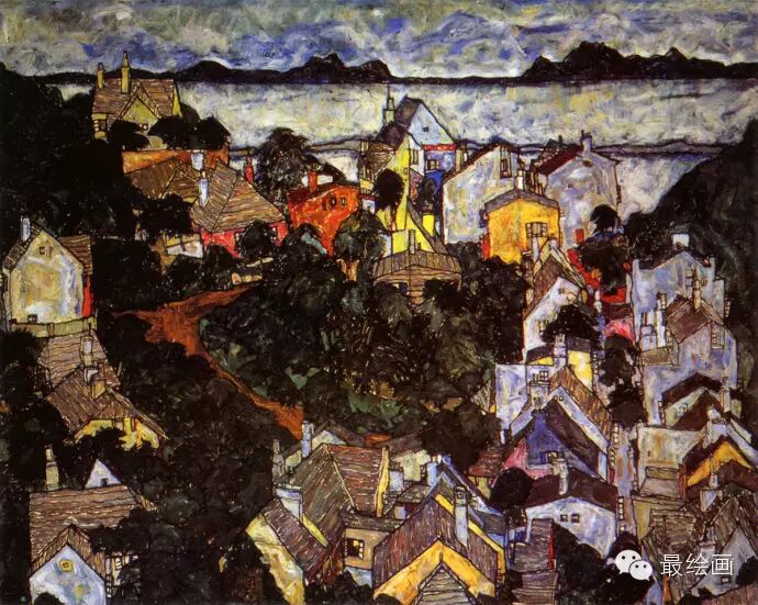 1890年6月12日,埃贡·席勒出生在下奥地利省的图尔恩小镇,这里位于维也纳以西约20英里。他从中学时代起就酷爱美术,利用业余时间勤奋作画,在他早期作品中可以看到克洛斯特新堡的教堂和修道院。学院派和印象派的画法为他打下了坚实的造型基础。在受到克里姆特和科柯施卡的影响后,作品突具装饰风格。如果说克里姆特的艺术是从象征主义走向表现主义,而席勒则已走进了纯粹的表现主义天地。其绘画特别强调人手和脸部神经与血管在刹那之间的表情,并细致入微地刻画出来,可以清晰地看到人物情绪的变化。1918年秋天,他因流感而身故,年仅二十八岁。近百年来,这位英年早逝的天才艺术家越来越受到人们的推崇,他创作的300多幅绘画已经销售一空了。由于审美观点不同,我更偏爱他的风景画作品。