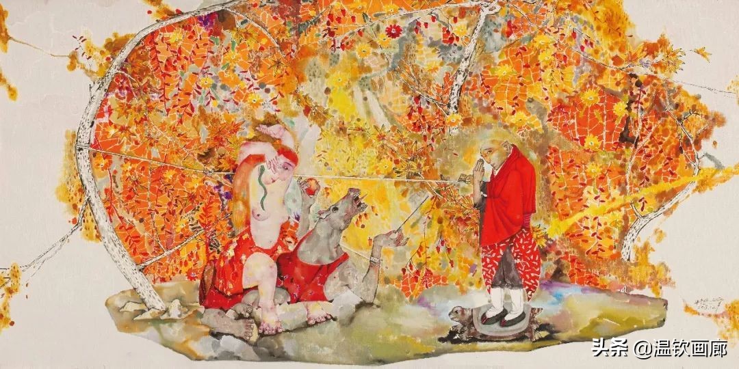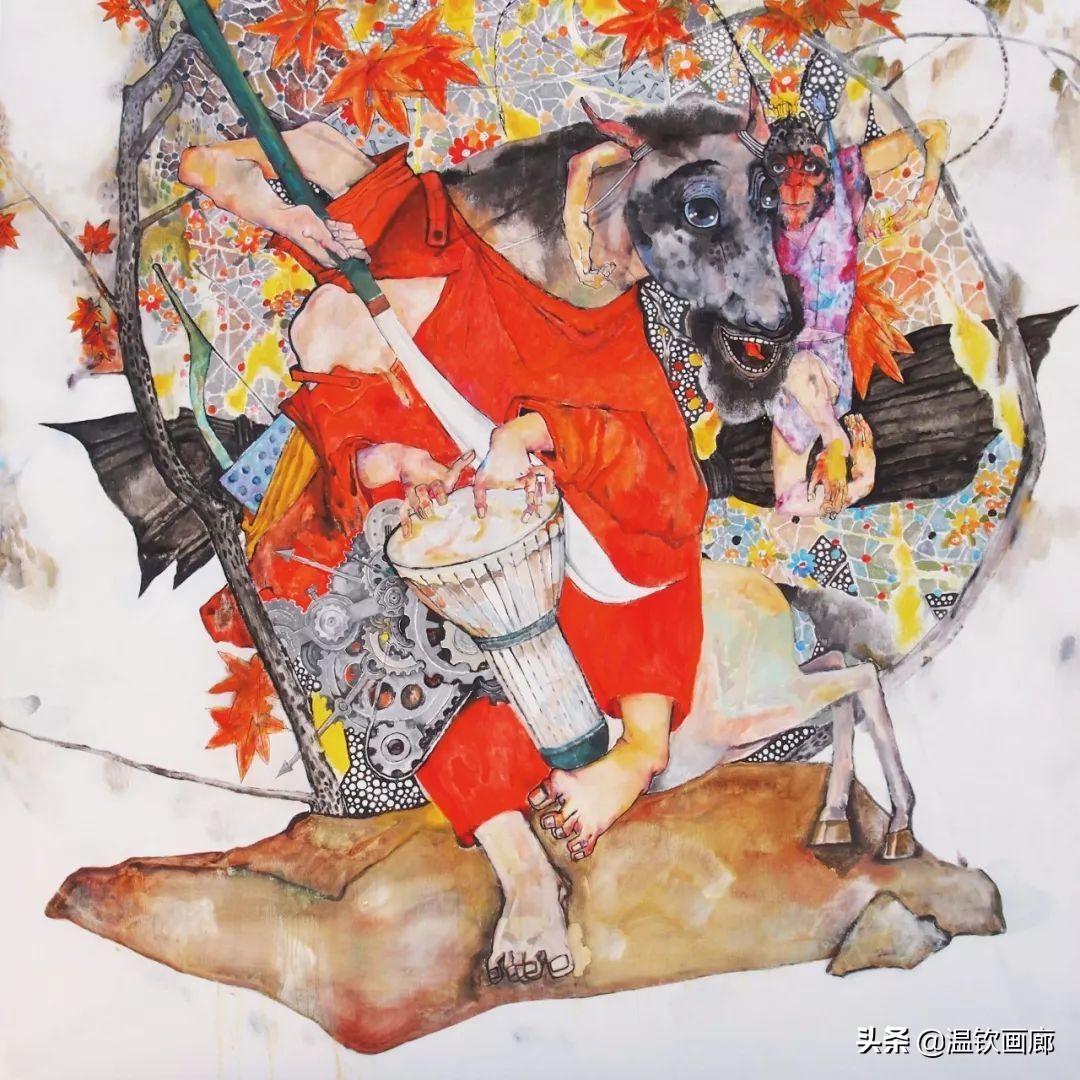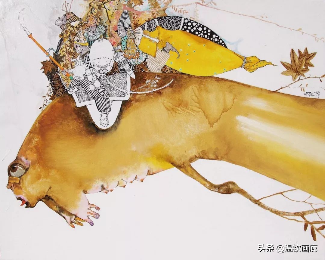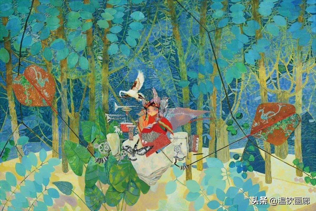 首先在画面上播下一棵种子逐渐让他长大漫漫地枝繁叶茂,各种生灵、怪鸟、仙子应运而生。我把这些带有隐喻性的事物经过特殊的排列和组合,形成了独特的画面,能够带给人超乎于现实的真实。只有通过这种对异象的架构和组合才能充分的表达自己的情感。它融合了意识、偏见、记忆、理解、情绪、梦幻、想象,还有生理的骚动、反射,心理的感知,正常的、非正常的、变态的、以及无法言说的……这所有的存在构成的“同一体”。也正因为如此,它的表现就比正常的、理智的、社会性的、规范化的一切标准跟接近“真”。